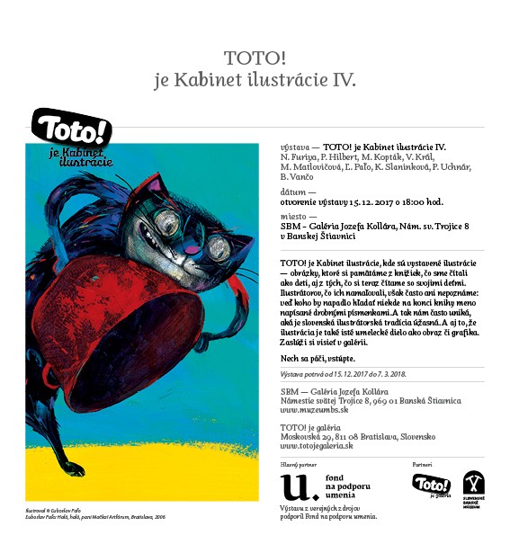 Kabinet ilustrácie IV. — tentoraz o autoroch, ktorí majú dnes medzi 40-tkou a 50-tkou.  Od nežnej Petry Hilbert cez veselé koláže a maľby Martiny Matlovičovej, Vladimíra Krála a Bystríka Vanča, aj pentelkové kreácie Katy Slaninkovej, naopak maľby Petra Uchnára a Nany Furiye, a zádumčivé kreácie od Ľuba Paľa až po ironické kompozície Miloša Koptáka. To všetko na stenách Galérie Jozefa Kolára v Banskej Štiavnici.